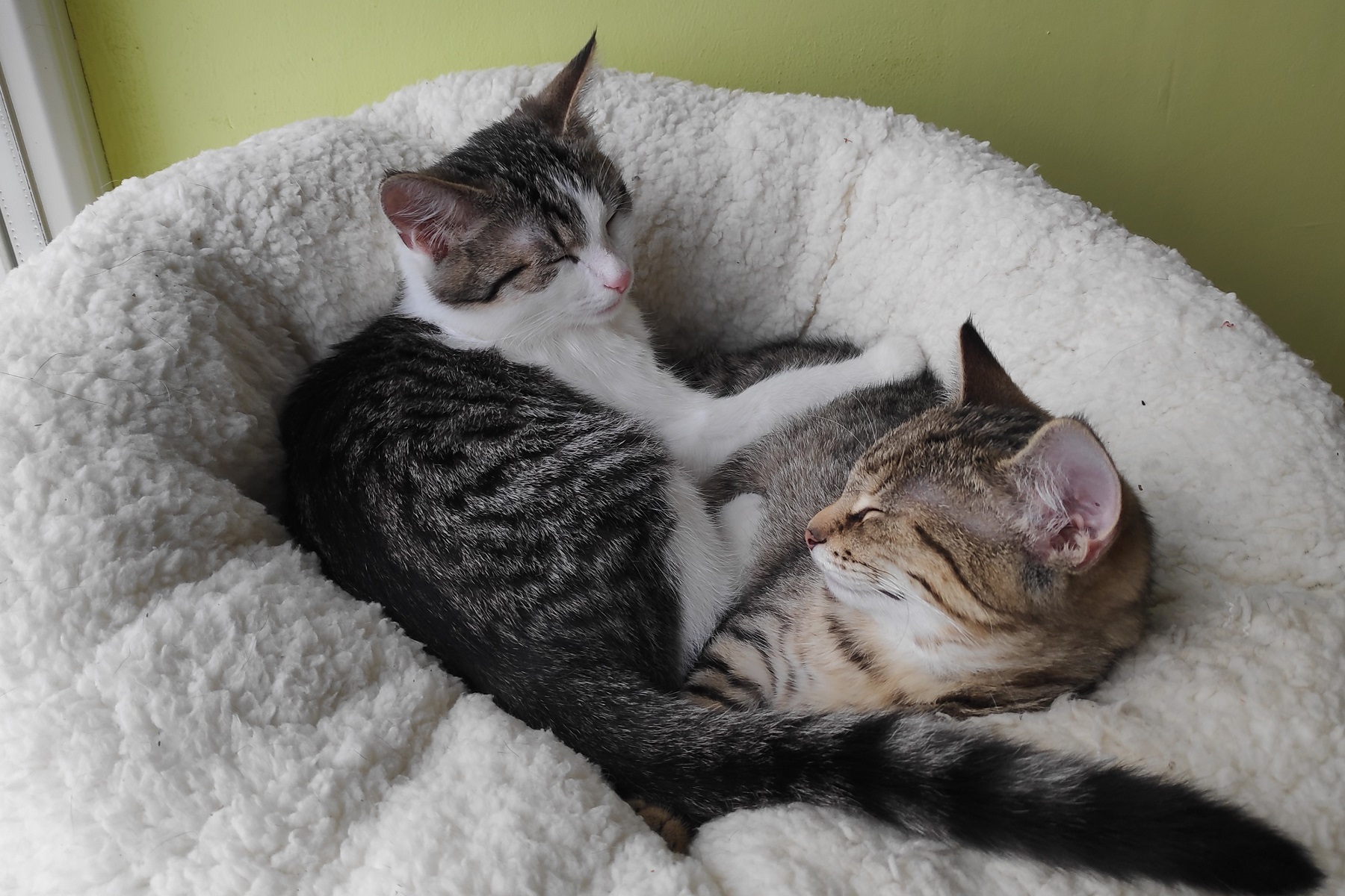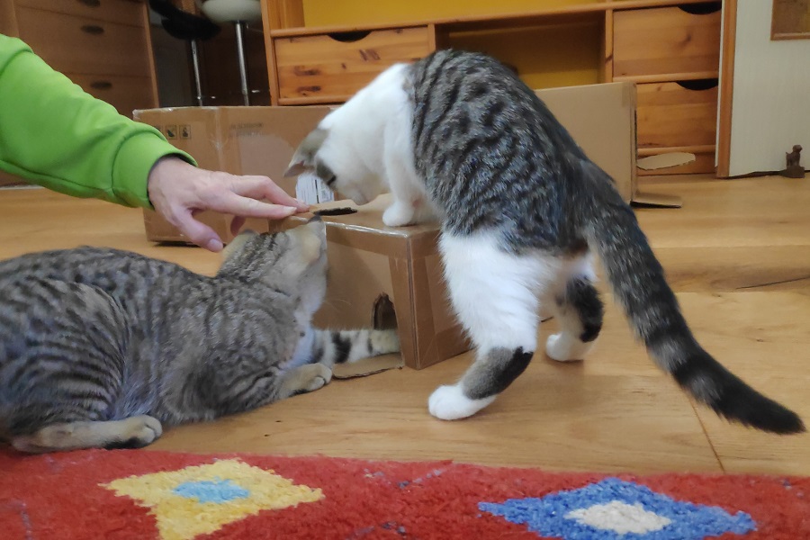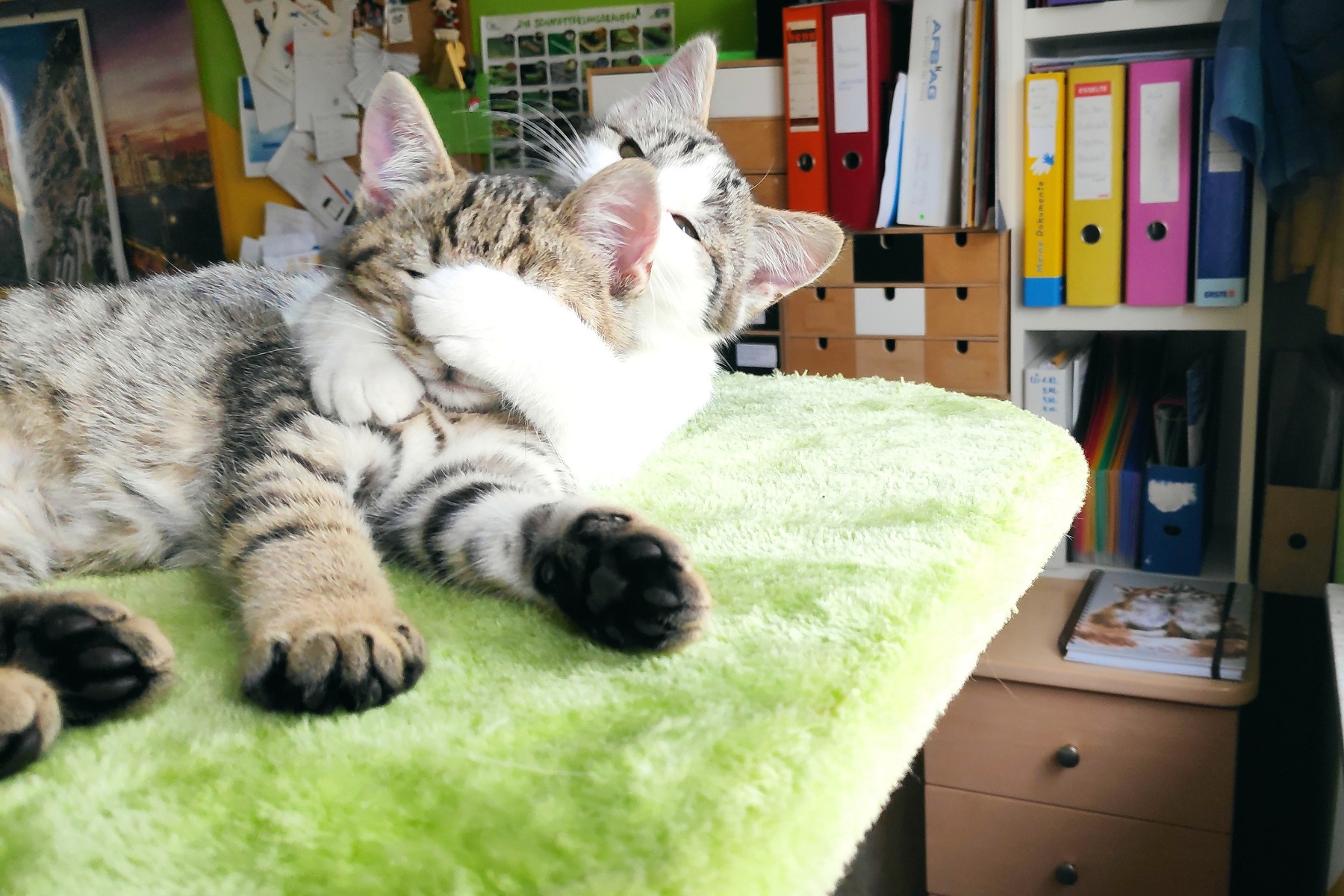 Das Futter schmeckt, der Kratzbaum ist ein toller Schlafplatz und wir sind absolut stubenrein – auch wenn’s manchmal schnell gehen muss!