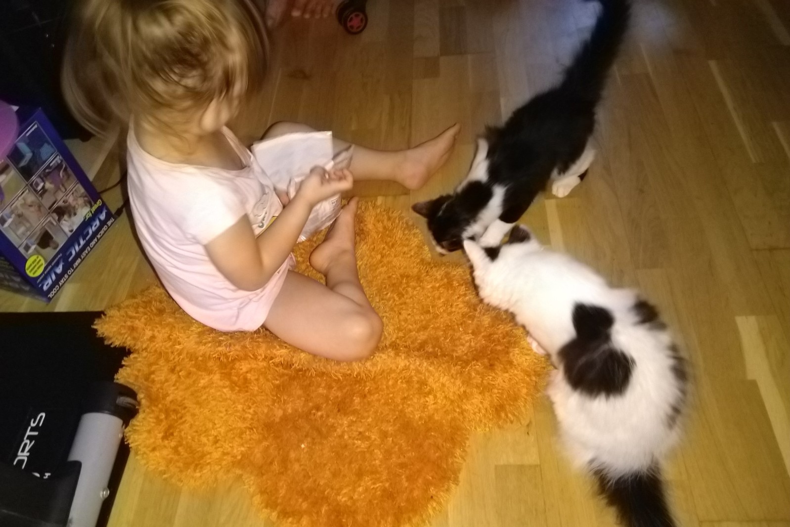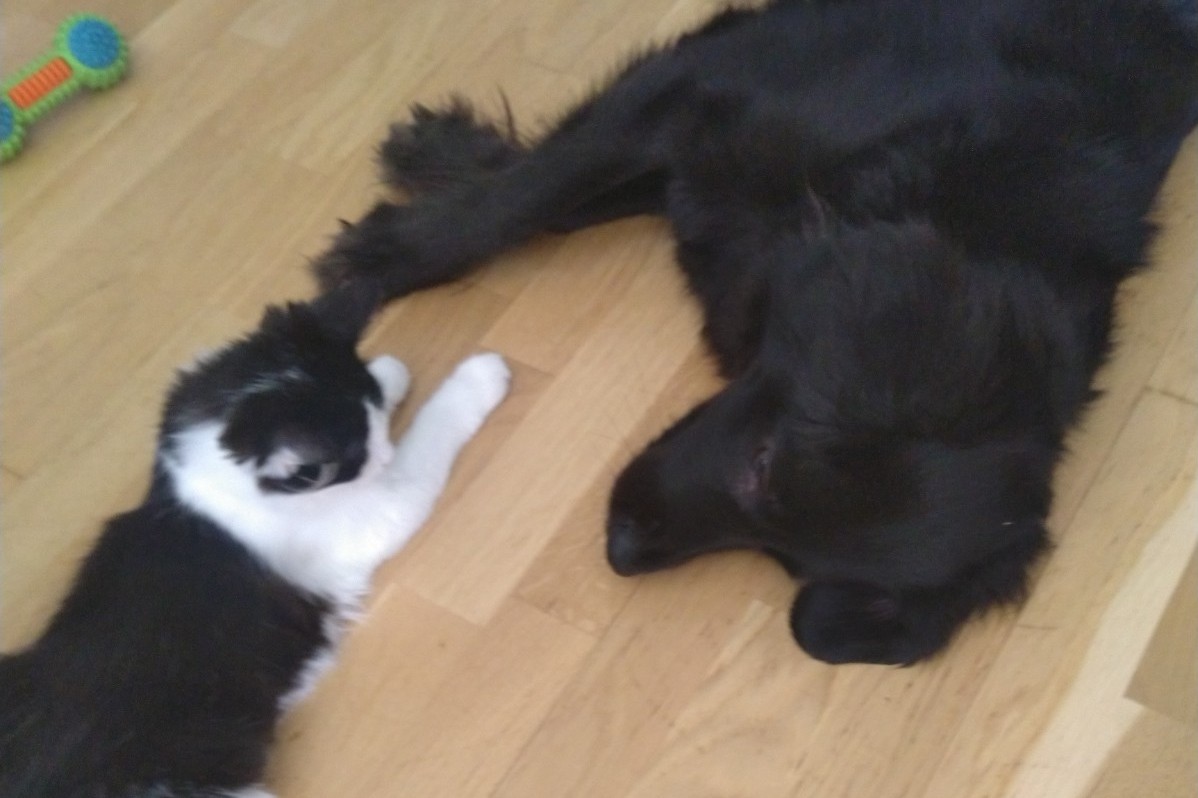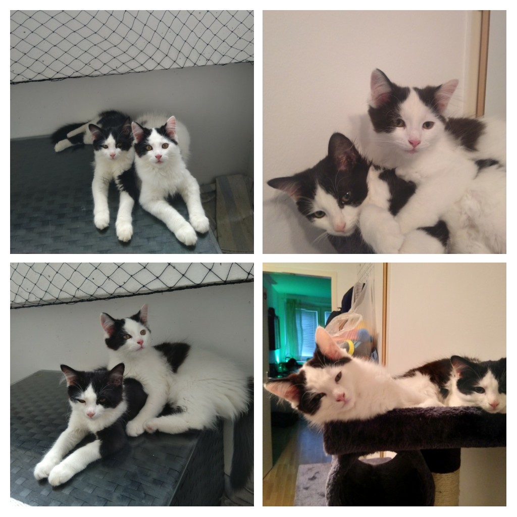 Nun sind wir seit einem Monat in unserer neuen Familie und haben uns prima eingelebt. Wir haben eine Hunde-Dame als neue Freundin / Mama-Ersatz. Sie Kuschelt & spielt mit uns und hat uns sogar durch die Wohnung getragen. Unsere Zweibeiner passen gut auf uns auf. Die Kinder (4&12 Jahre) Kuscheln sehr viel mit uns und geben uns Leckerlis. Wir haben sie so lieb das wir unter Tags die zeit ihn ihren Kinderzimmern verbringen.