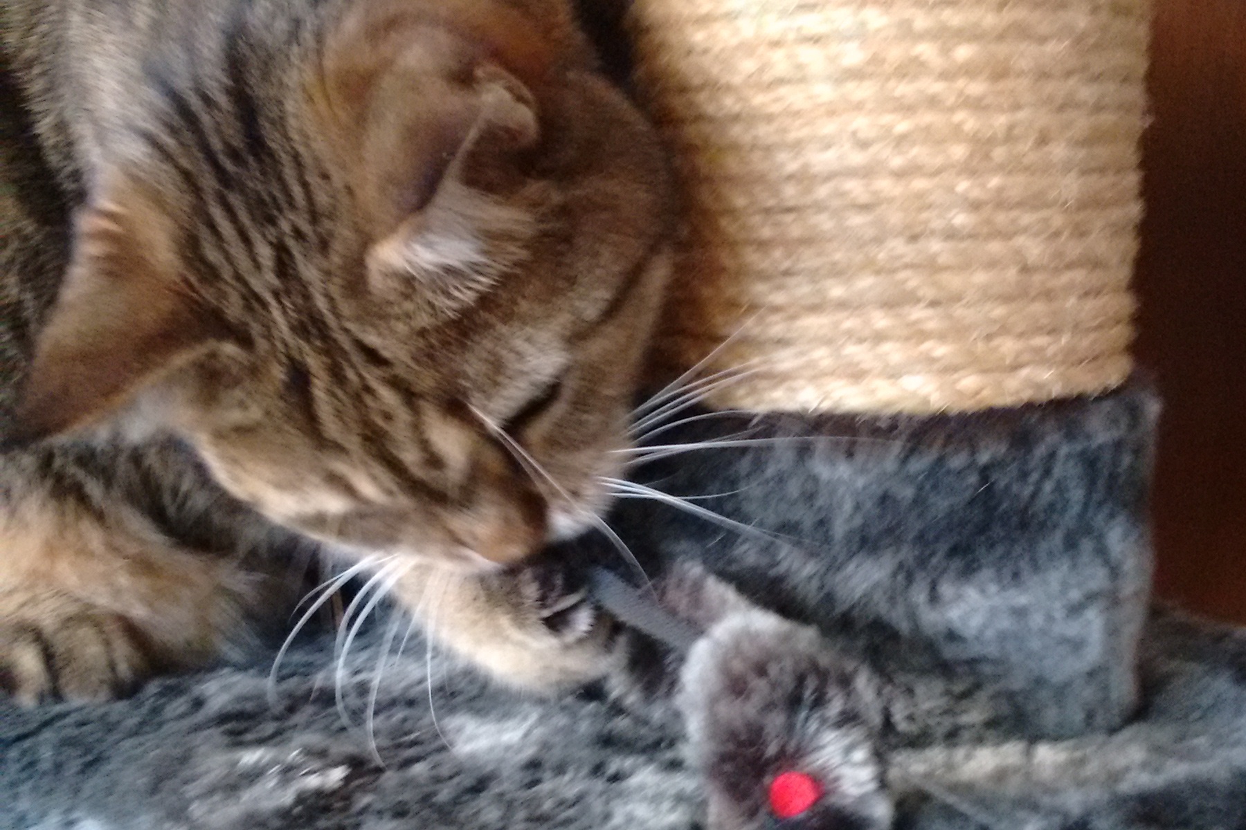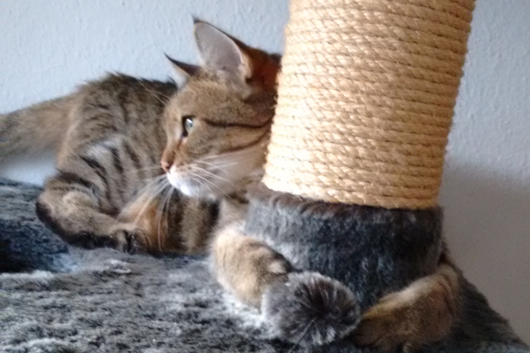 Schritt für Schritt habe ich die vielen möglichen Liegeplätze und die Kratzbäume erforscht. Kurt war auch sehr erstaunt, wie gerne ich spiele. Angeln, Mäuschen, Bälle sind jetzt in ausreichender Menge vorhanden und mein Gefährte lernt jetzt auch schön langsam, wann mein Mauzen Hunger bedeutet und wann es Ausdruck für Lust auf Spielen ist.