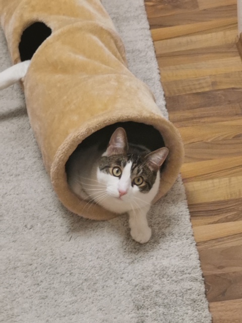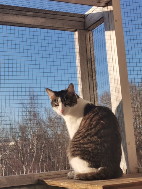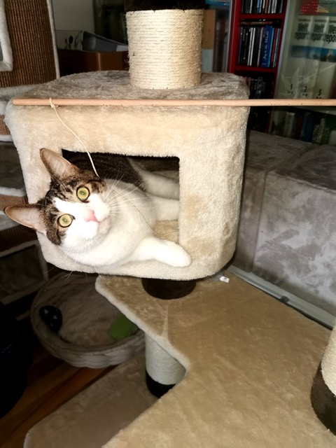 Wir spielen viel miteinander und sollte es doch noch zu wenig sein schleppt Bora die Katzenangel mit Feder oder eine Strohkugel durch die Wohnung und legt mir das bevorzugte Spielzeug vor meine Füße. Ängstlich ist er gar nicht, manchmal etwas vorsichtig. Er liebt es am Balkon zu sitzen um die Umgebung zu beobachten.